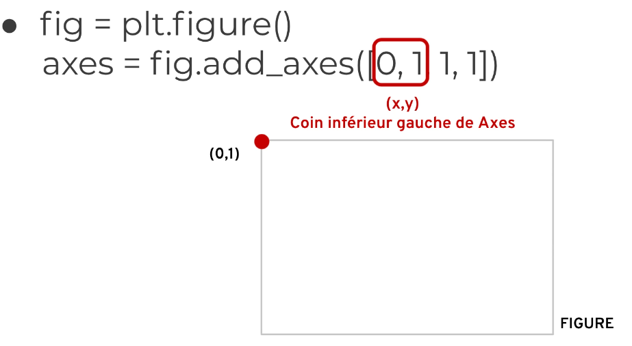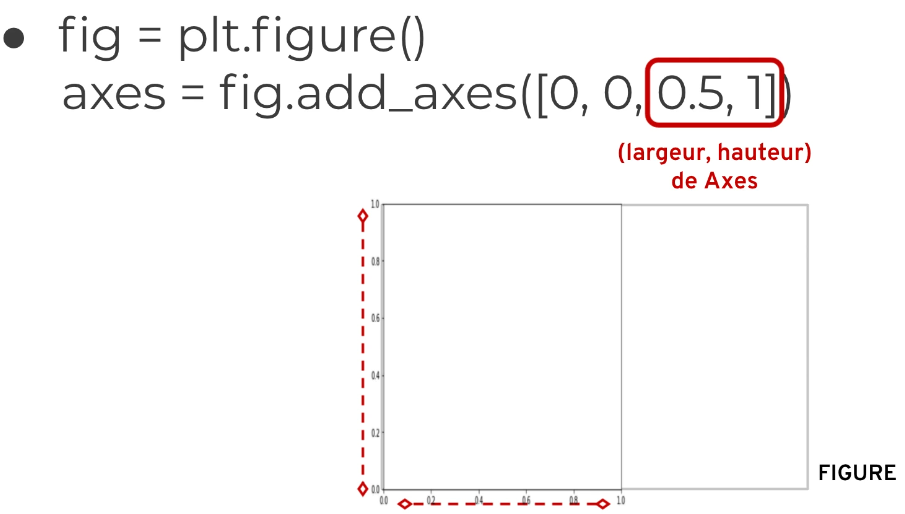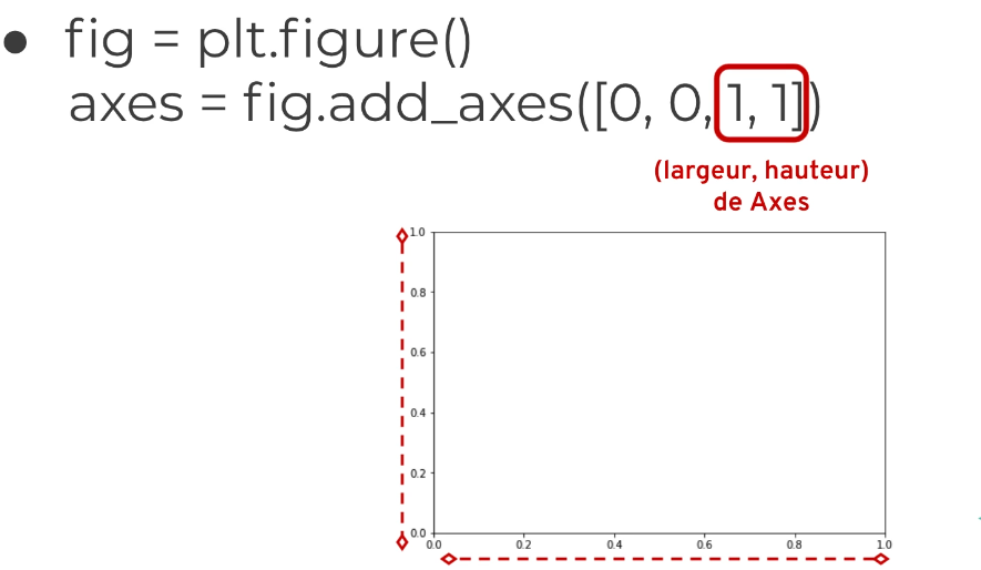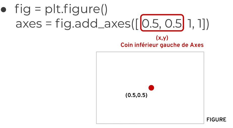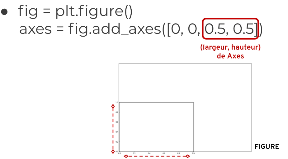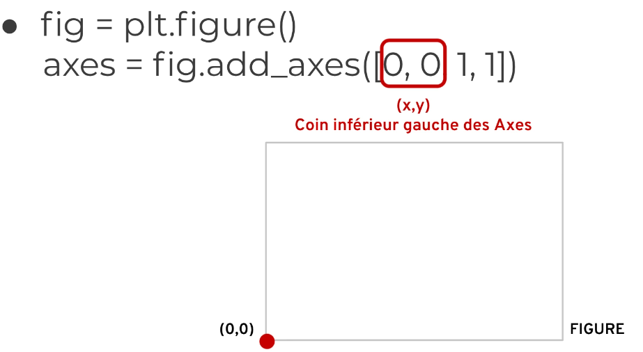 fig.add_axes([0, 0, 1, 1]): l'axe occupe toute la figurefig.add_axes([0, 0, 0.5, 0.5]): l'axe occupe la moitié de la largeur et de la hauteurfig.add_axes([0.5, 0.5, 0.5, 0.5]): l'axe commence au centre et occupe la moitié de la figure